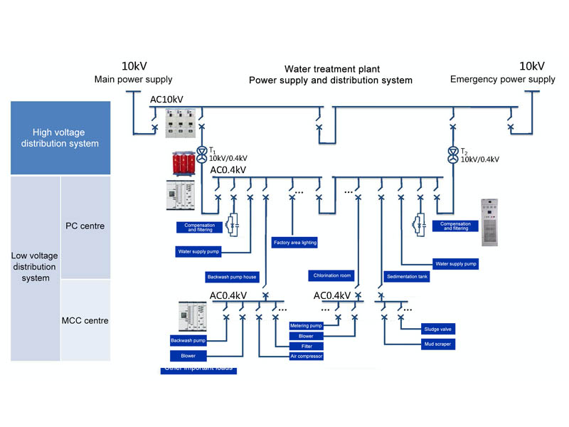 Решения для интеллектуальных систем распределения электроэнергии для водопроводных станций и очистных сооружений в основном включают в себя центральную распределительную комнату и соответствующее распределительное оборудование среднего и низкого напряжения, коробки управления, шкафы управления и соответствующее вторичное оборудование для мониторинга. ПЛК и защиту микрокомпьютера в центральной распределительной комнате. и различные мастер-классы по дополнительной обработке. , счетчики электроэнергии, управление энергоэффективностью и т. д. Среди них соответствующее оборудование распределения электроэнергии в каждой секции может быть загружено в общий диспетчерский центр через соответствующее вторичное оборудование мониторинга через централизованную систему управления для реализации полного интеллектуального управления.