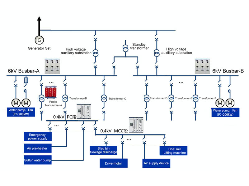 Система среднего напряжения подает питание на оборудование низкого напряжения, осветительное оборудование и оборудование для технического обслуживания завода через трансформаторы, используемые на заводах среднего и низкого напряжения. Низковольтная вспомогательная энергосистема обычно использует режим питания ПК силового центра и центра управления двигателем MCC. Для источников питания ПК и MCC компания Zhegui Electric предлагает низковольтные распределительные шкафы SIVACON 8PT, одобренные Siemens, низковольтные распределительные шкафы Blokset и низковольтные распределительные шкафы MNS, одобренные Schneider, все из которых были полностью протестированы на соответствие требованиям безопасности. Соблюдайте требования по защите низковольтных распределительных линий, а также требованиям по защите и контролю двигателя.